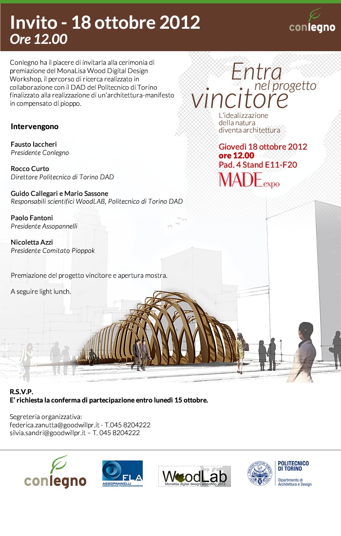 Si chiama Pop.for.Pav il progetto che ha vinto il Mona_Lisa Workshop, il cui obiettivo era la sperimentazione di un percorso di ricerca progettuale finalizzato alla realizzazione di una architettura-manifesto in compensato di pioppo - il Mona_Lisa Pavillion – che sarà realizzato in occasione della prossima edizione di MADE expo, in programma a Milano dal 17 al 20 ottobre prossimi, in collaborazione con Assopannelli–FederlegnoArredo, l'associazione Pro-populus, l'Istituto C.R.A.-PLF di Casale Monferrato e il dipartimento Agroselviter dell'Università di Torino.